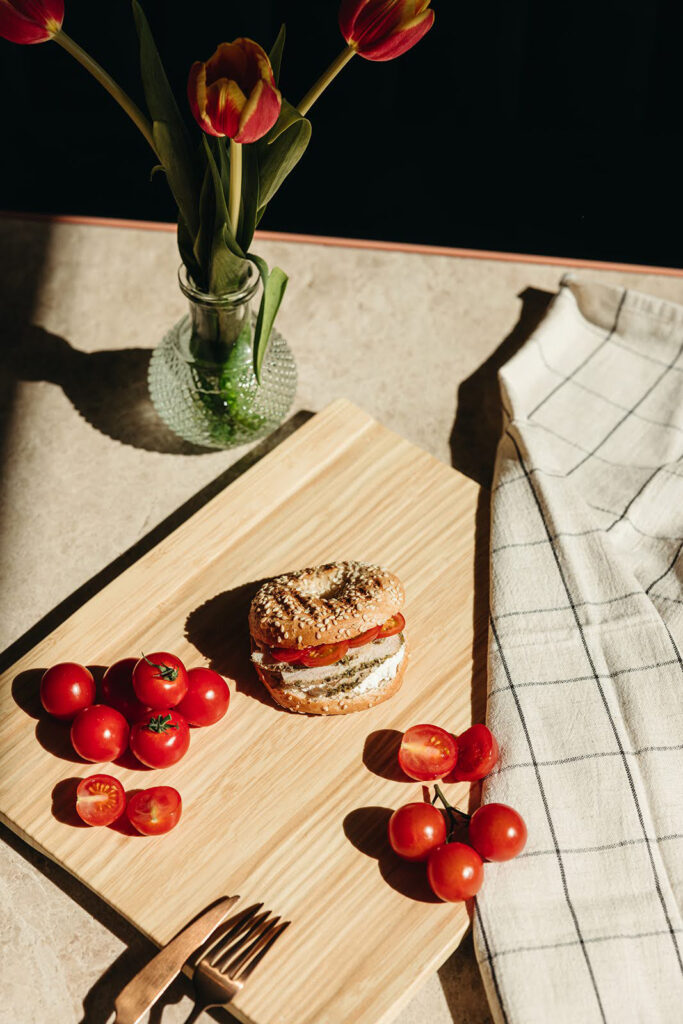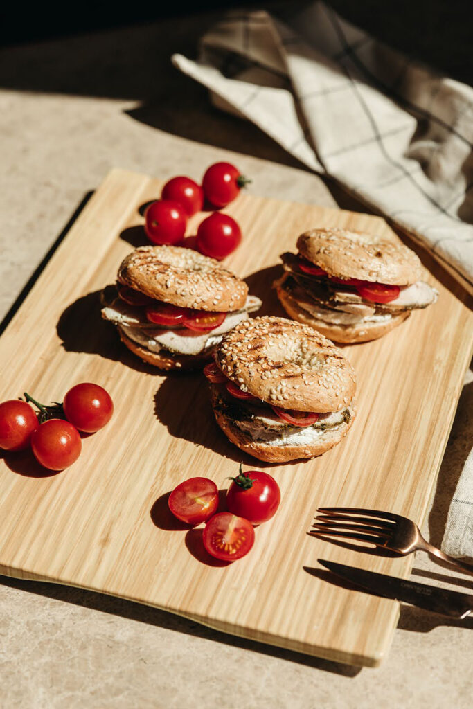 El bagel queda compacto, limpio y muy cómodo para llevar o servir en mesa.