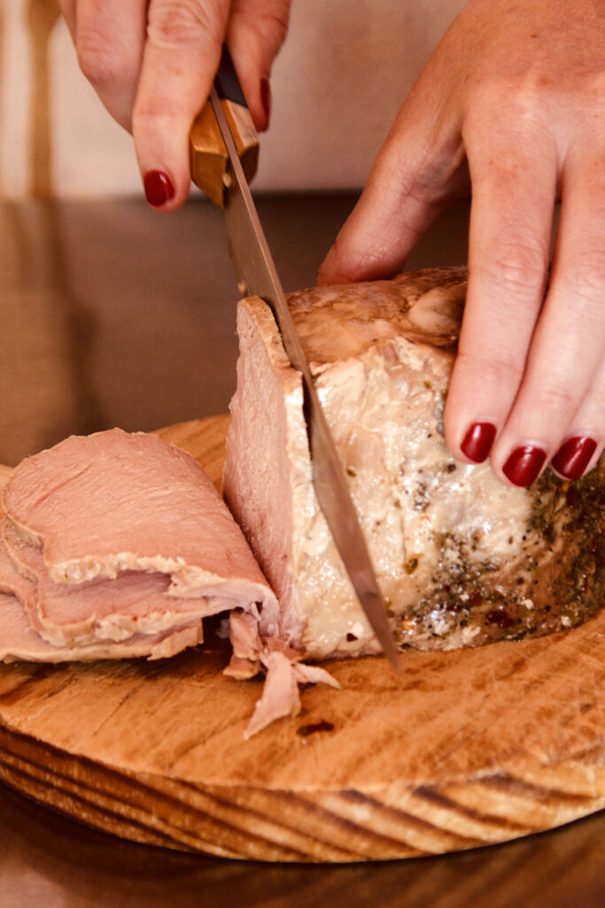 Cortar el Pastrami de Cabeza de Lomo TOC AWAY en lonchas finas.
