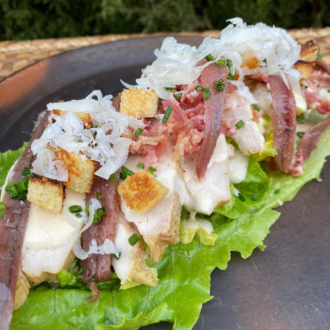 Elaboramos la clásica Ensalada César que no puede falta en ninguna carta, pero le damos un giro a la presentación y además le añadimos nuestra sabrosa pechuga de pollo a las finas hierbas. No te vas a poder resistir a esta combinación.